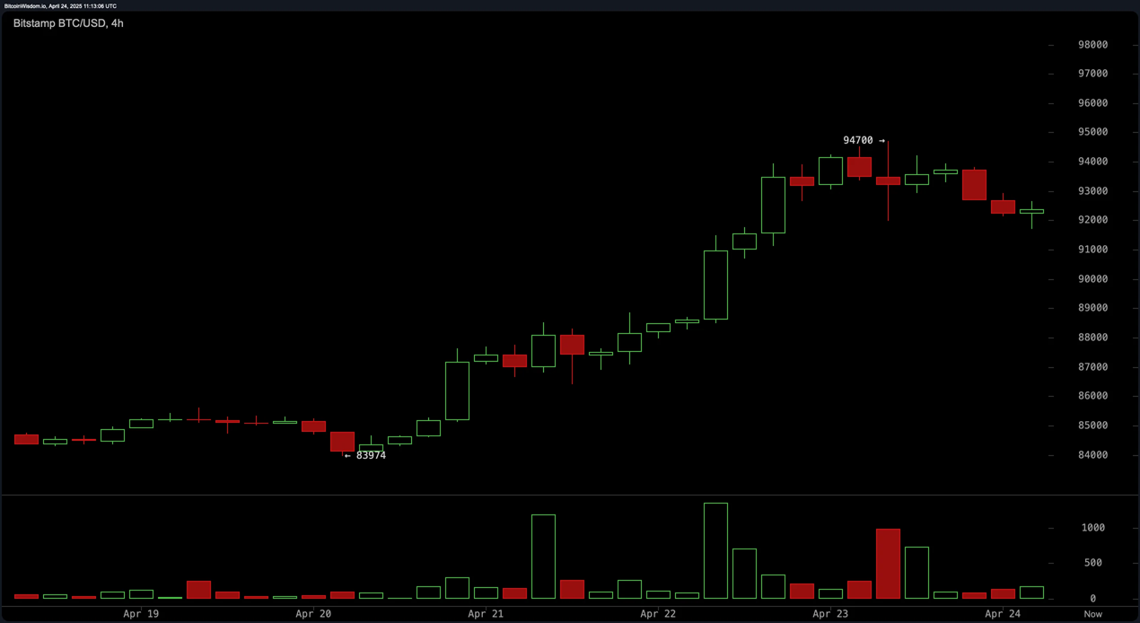 Although the overall trend is still bullish, the overbought oscillators and the short-term distribution pattern could create corrective pressure back to the $90,000 area, or even lower if the $91,700 support fails to hold.