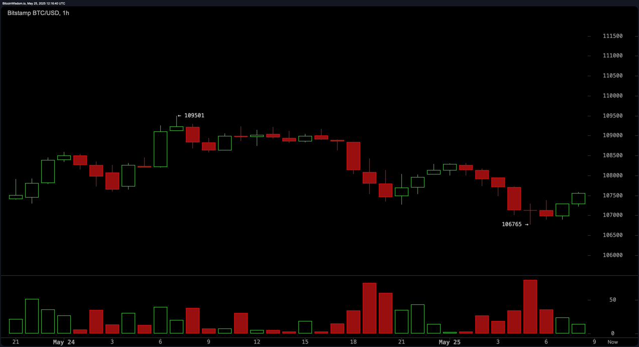 On the 1-hour chart, BTC is attempting to stabilize after a short-term downtrend, currently supported at $106,765. Technical signals point to a possible double bottom pattern, or a subtle bullish divergence between price and volume. Specifically, the volume has been decreasing during the dips but increasing slightly with green candles – a sign that buying pressure may be returning.