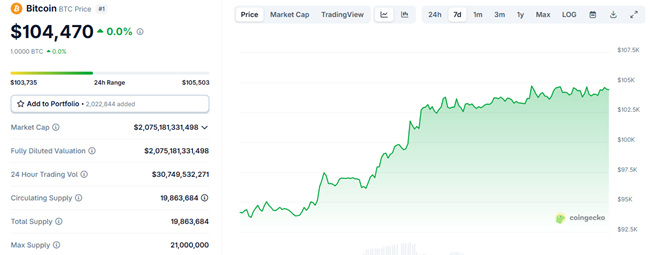 In contrast to gold, Bitcoin – often referred to as “digital gold” – continues to demonstrate its resilience to political and economic volatility. As of mid-day on May 12, Bitcoin remained above $104,000, maintaining a stable state since surpassing the psychological $100,000 mark earlier this month.