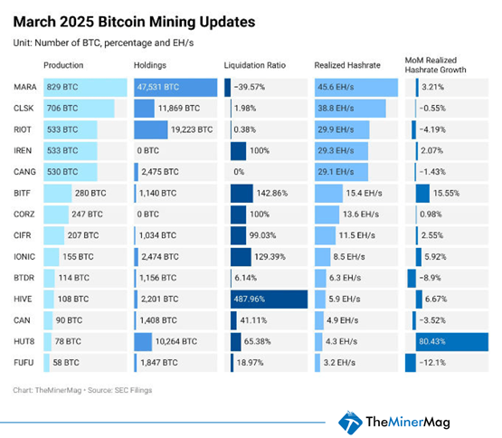 While the majority of the market has been struggling, some companies like Bitfarms and Hut 8 have grown their hashrate by 16% and 80% respectively over the past month. Marathon Digital (MARA) is still leading the pack with over 40 EH/s. However, this does not reflect overall stability as many listed companies were forced to sell up to 42% of their mining output in March – the highest level since October last year.