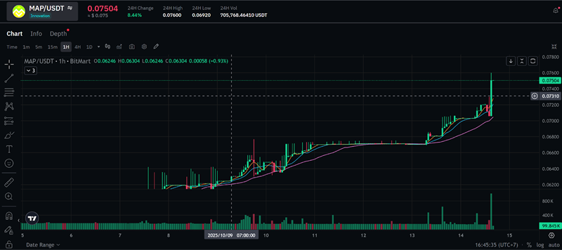 The market is witnessing MAP/USDT continue to show impressive strength as the price holds steady above 0.081 USDT, up slightly more than 5.2% in the past 24 hours, showing that the growth momentum is still sustainable after a series of consecutive breakout sessions.