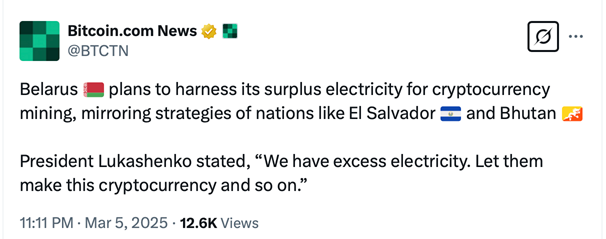 Lukashenko's statement - "We have surplus electricity. Let them make cryptocurrency" - was quoted by BelTA, referring to a new strategy to profit from unused energy. Options include state-controlled cryptocurrency mining or selling electricity to private companies. Belarus's approach mirrors El Salvador's geothermal bitcoin mining model and Bhutan's use of hydropower in cryptocurrency mining.