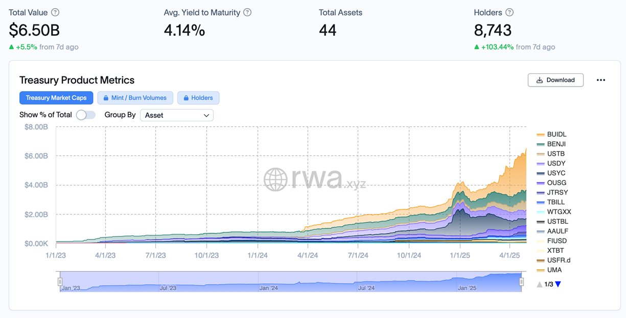 The on-chain real assets (RWA) market continues to explode as the total capitalization of tokenized treasuries increased by $560 million in just 15 days, bringing the total market value to an impressive $6.5 billion as of May 2, according to data from Rwa.xyz.